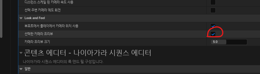 - 카메라 생성 후 에디터 개인설정 들어가서 카메라 프리뷰 체크 해제.