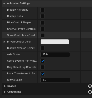애님 디테일 패널에는 선택한 컨트롤과 관련된 애니메이팅 가능 프로퍼티가 표시되며, 여기에는 자손 채널 컨트롤의 프로퍼티가 포함된다. 트랜스폼 값은 컨트롤 릭 에셋의 컨트롤에 정의된 초기 로컬값과 글로벌 값을 기준으로 하므로, 이러한 컨트롤의 영점은 해당 값들과 동일하다.