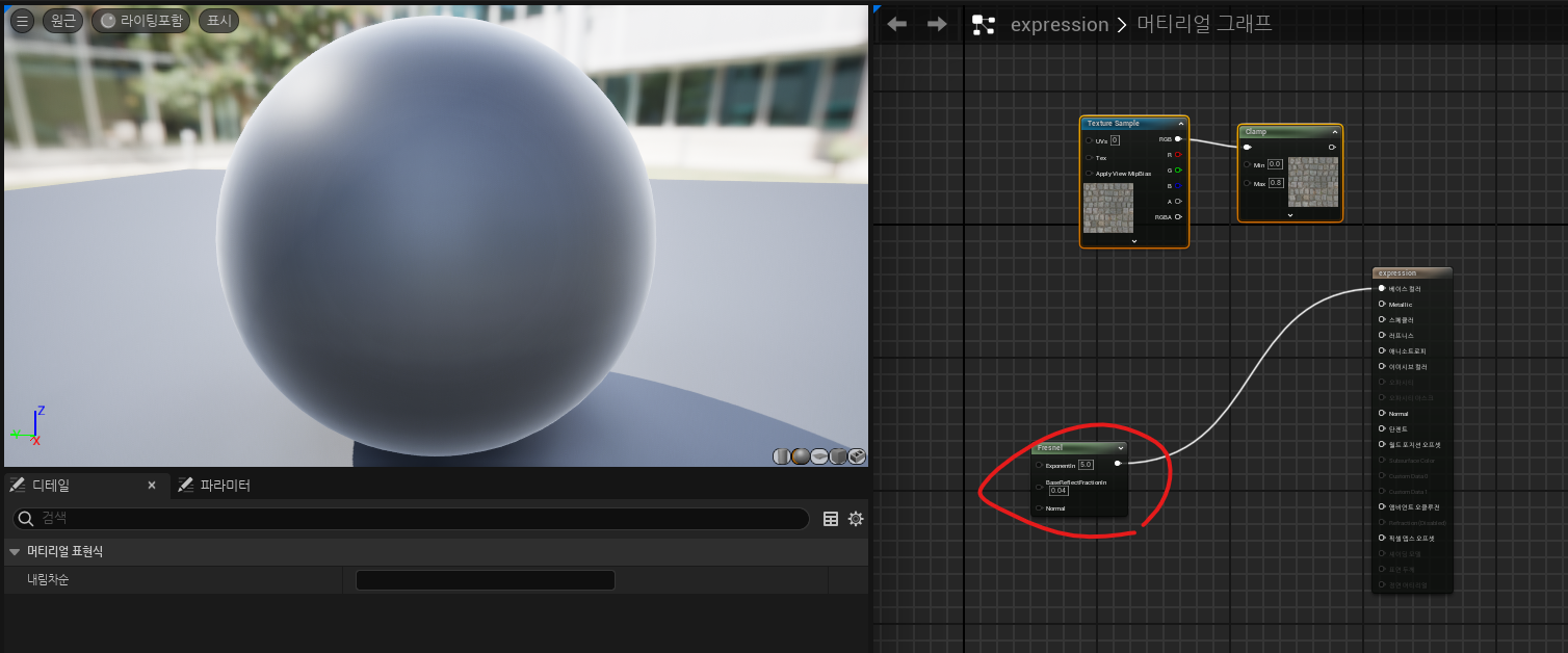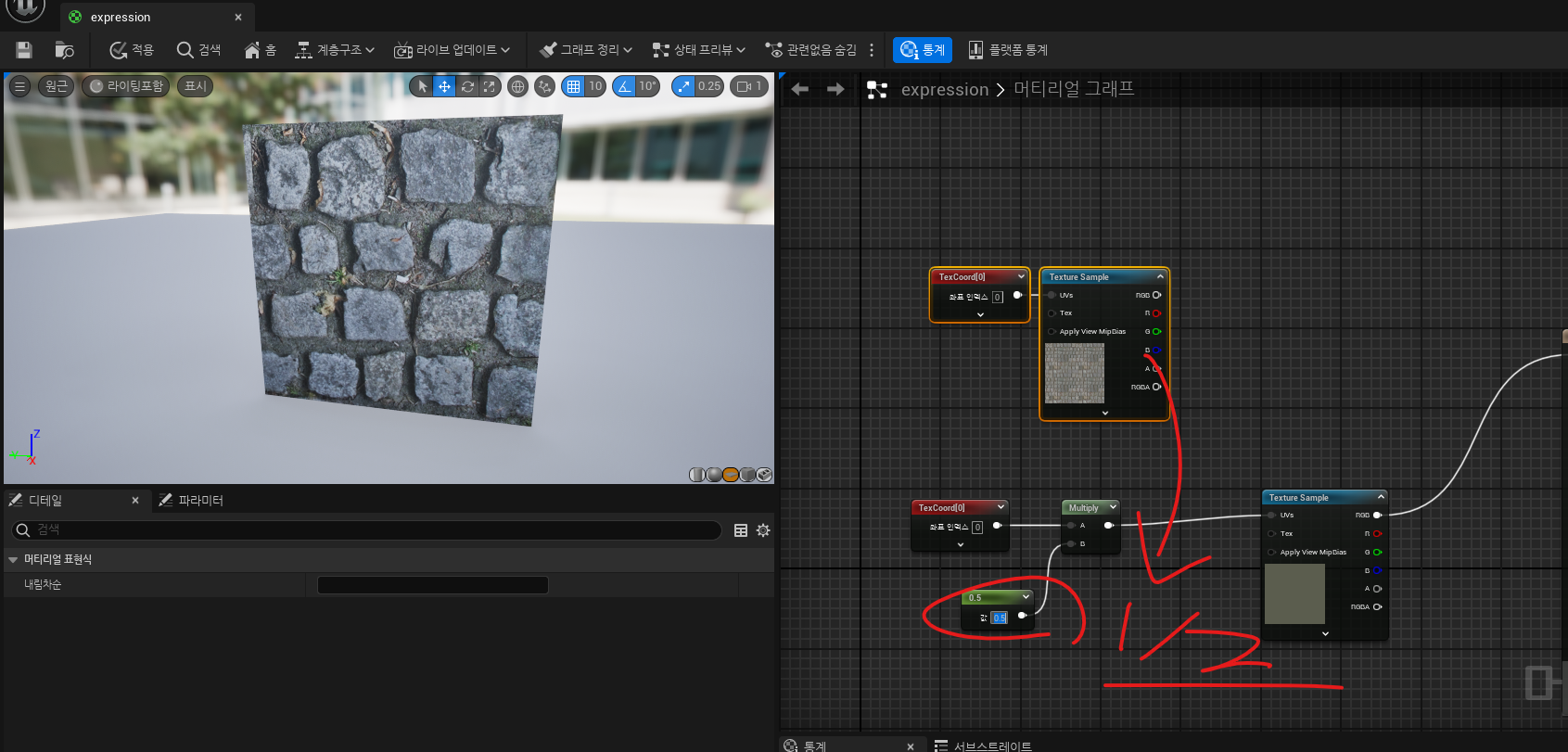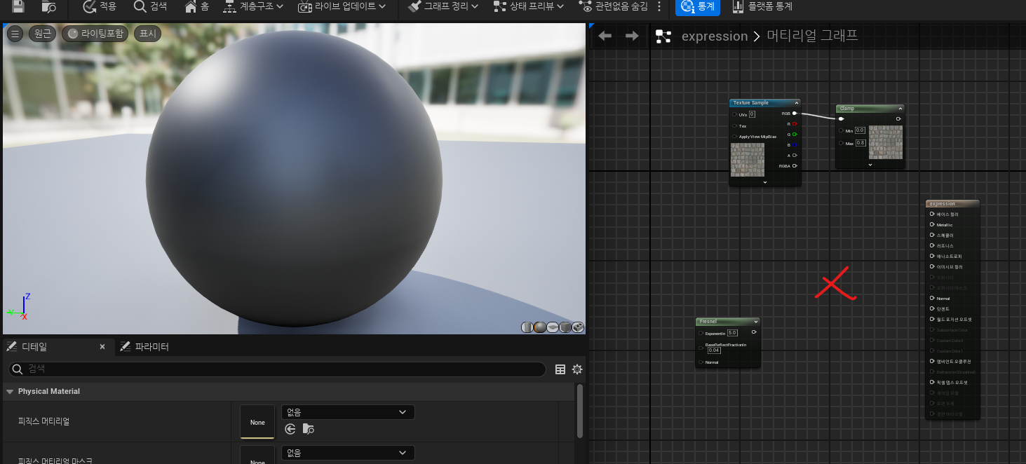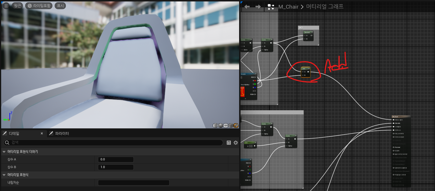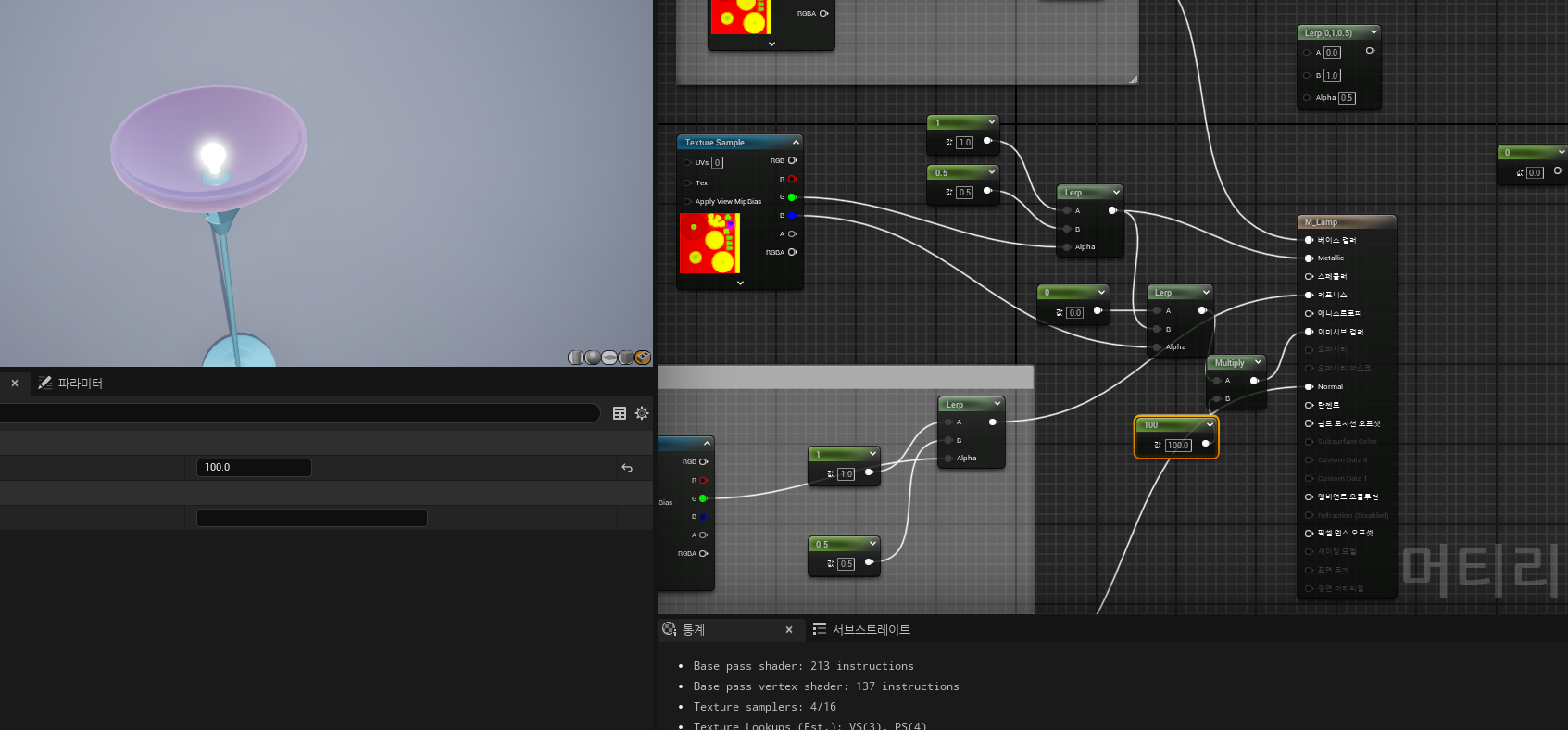 - lerp 노드와 텍스쳐 rgb값을 활용한 메터리얼