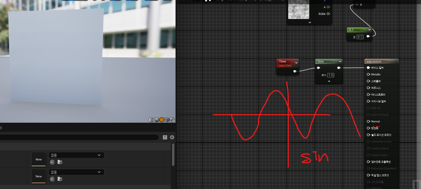 - sin함수노드에 따라 주기적으로 깜빡거리는 애니메이션이 첨가된 메터리얼을 제작할 수 있다.