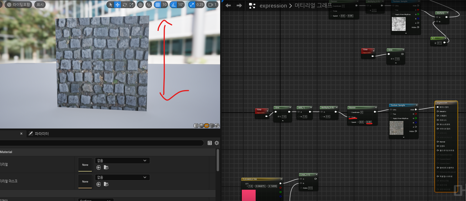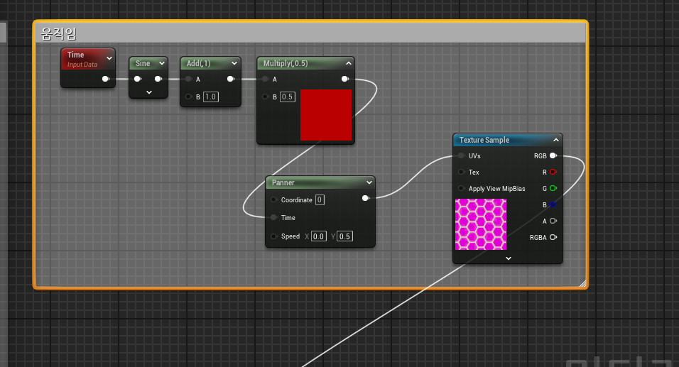 - Panner : 텍스쳐를 움직일 수 있는 노드. 스피드에 값을 입력하면 됨