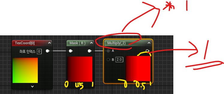 - 만약 멀티플라이 노드를 연결한다면 0.5 이후의 부분 전체가 1로 인식되며 가운데에 경계선이 생김