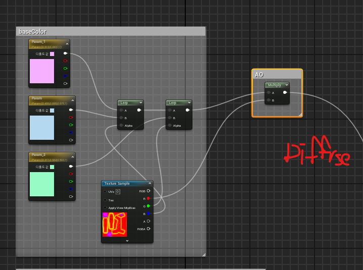 - base color lerp 노드 사용하여 컬러 변경 + r컬러 노드 이용하여 ao 추가