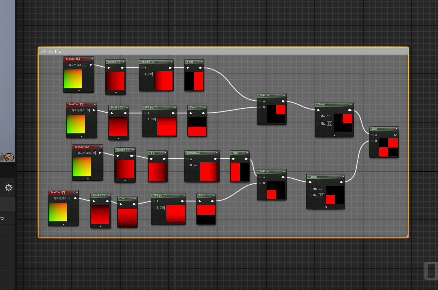 - 텍스쳐 코디네이트>mask로 레드 컬러만 남겨준다. power 노드를 붙히면 그라데이션 강도가 거세짐