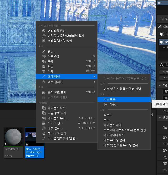 - 생긴 큐브 렌더 타깃을 우클릭-에셋액션-익스포트 해서 hdri로 뽑아냄