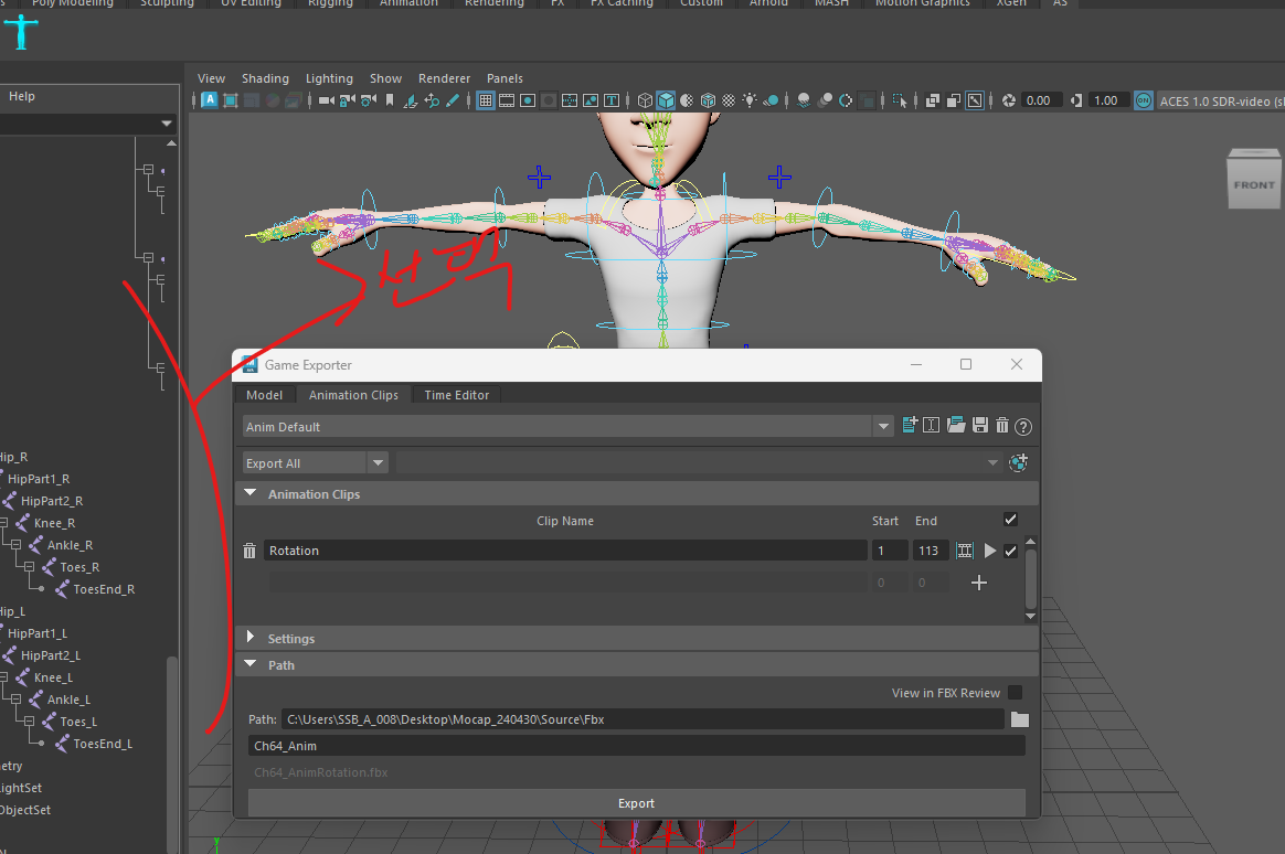 - 마야에서 하이라키로 모든 조인트를 선택한 뒤, 게임 익스포터>애니메이션 클립스>플러스로 애니메이션 추가 후 이름을 지ㅐ어준다. 이후 패스(경로) 설정하여 내보내기함