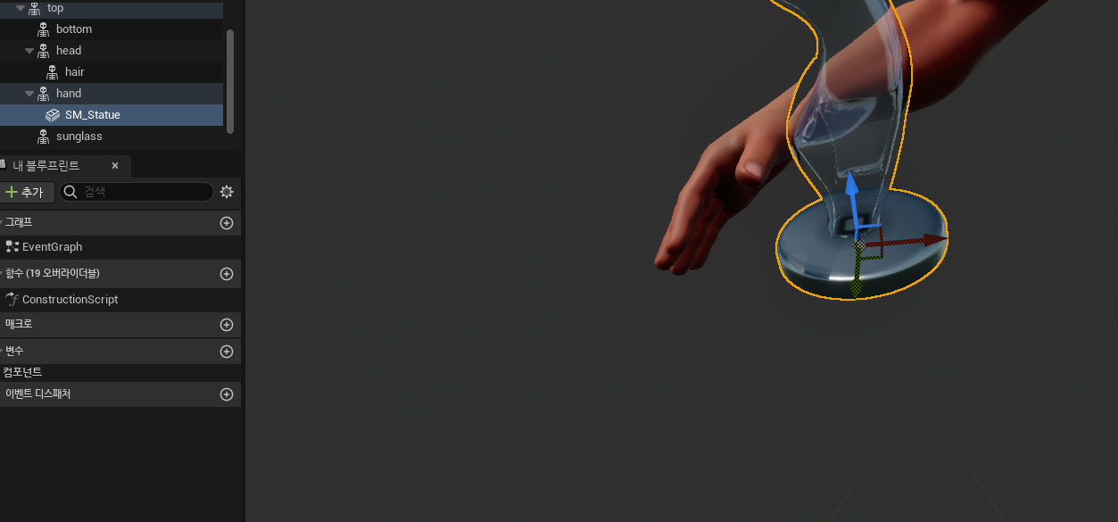 - 이런식으로 손 부분에 추가한 스태틱 매쉬가 들어옴.