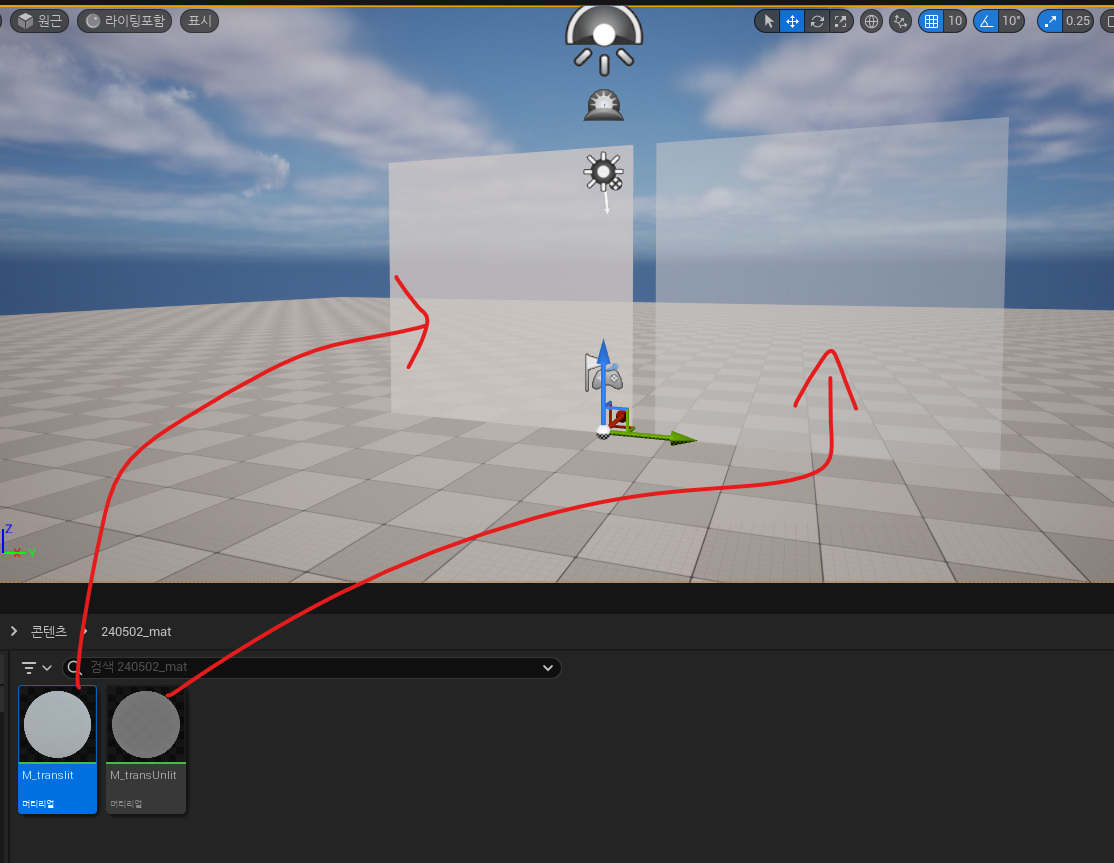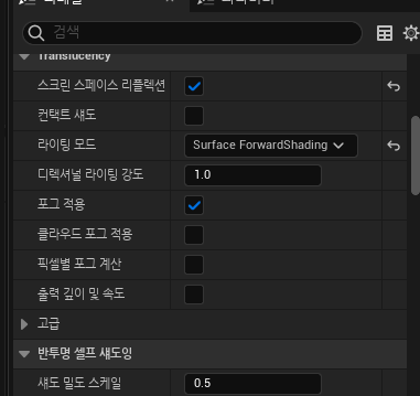 - 블렌드 모드를 translucent 로 바꿔서 반투명한 재질을 만듦. Lit 이란 최소한의 빛을 받겠다는 것
