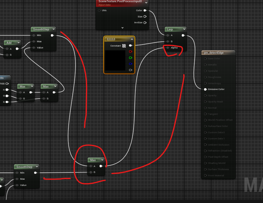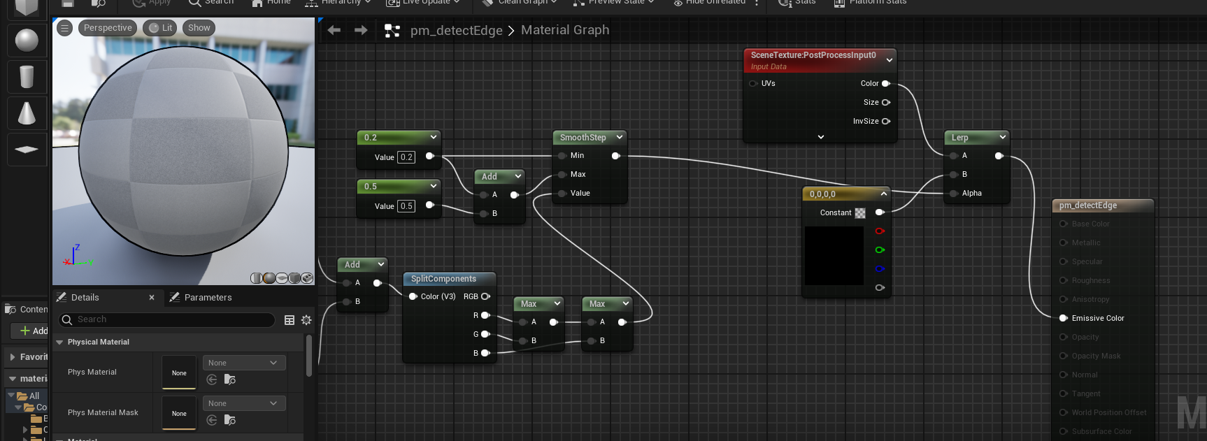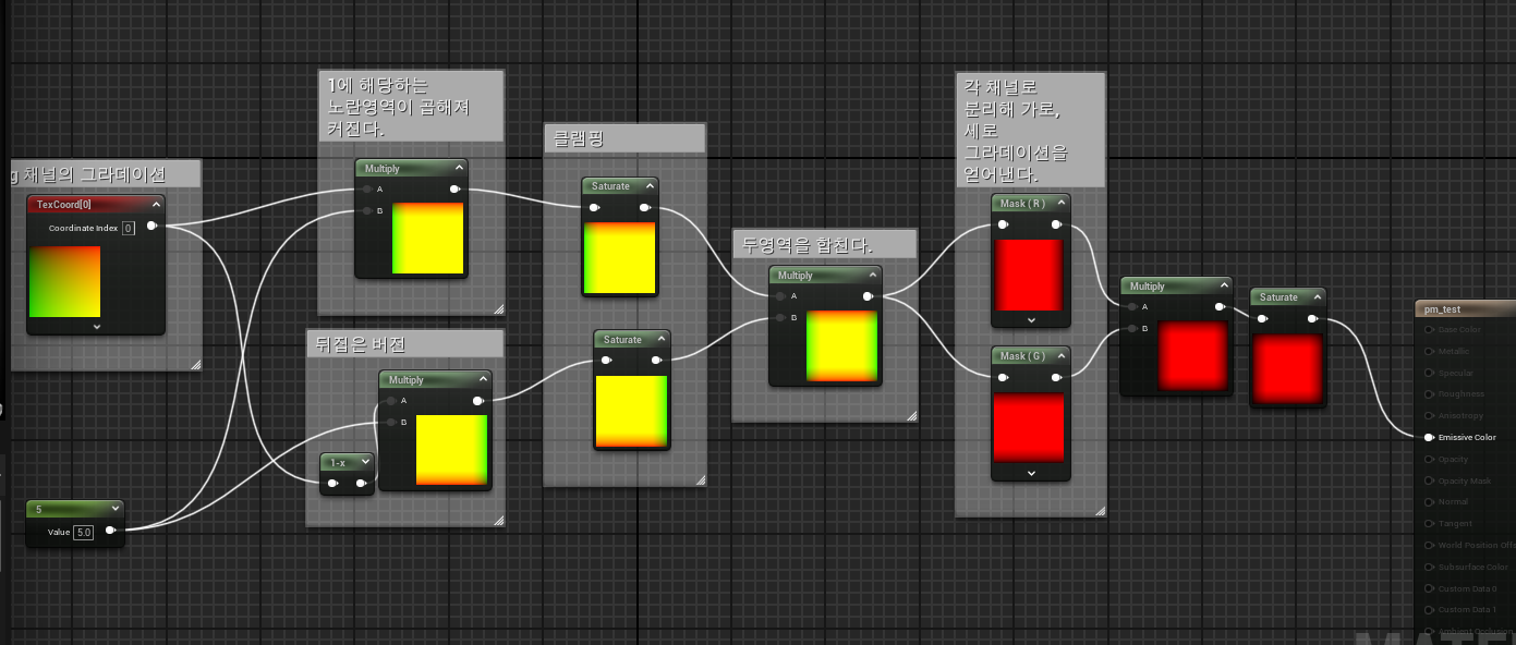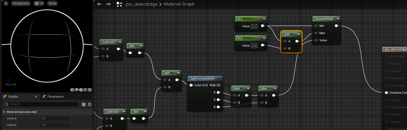 - 이후 러프 노드 사용하여 알파값으로 활용한 뒤 4벡터를 연결하여 아웃라인에 컬러를 넣어준다.