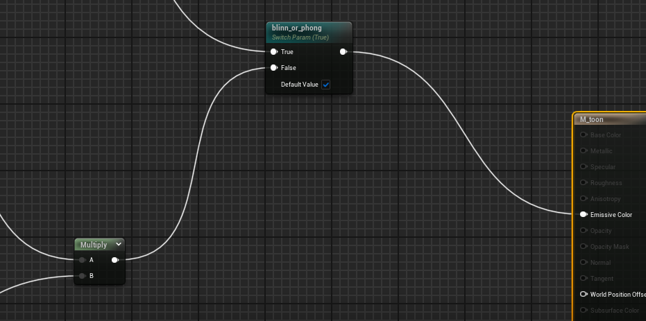 - switch 파라미터를 꺼내서 블린과 퐁을 각각 true와 false에 연결해주고 디폴트 밸류에 체크 이후 이미시브 컬러에 넣어준다. 이후 인스턴스에서 블린과 퐁 둘 중 스위치하는 것이 가능함.